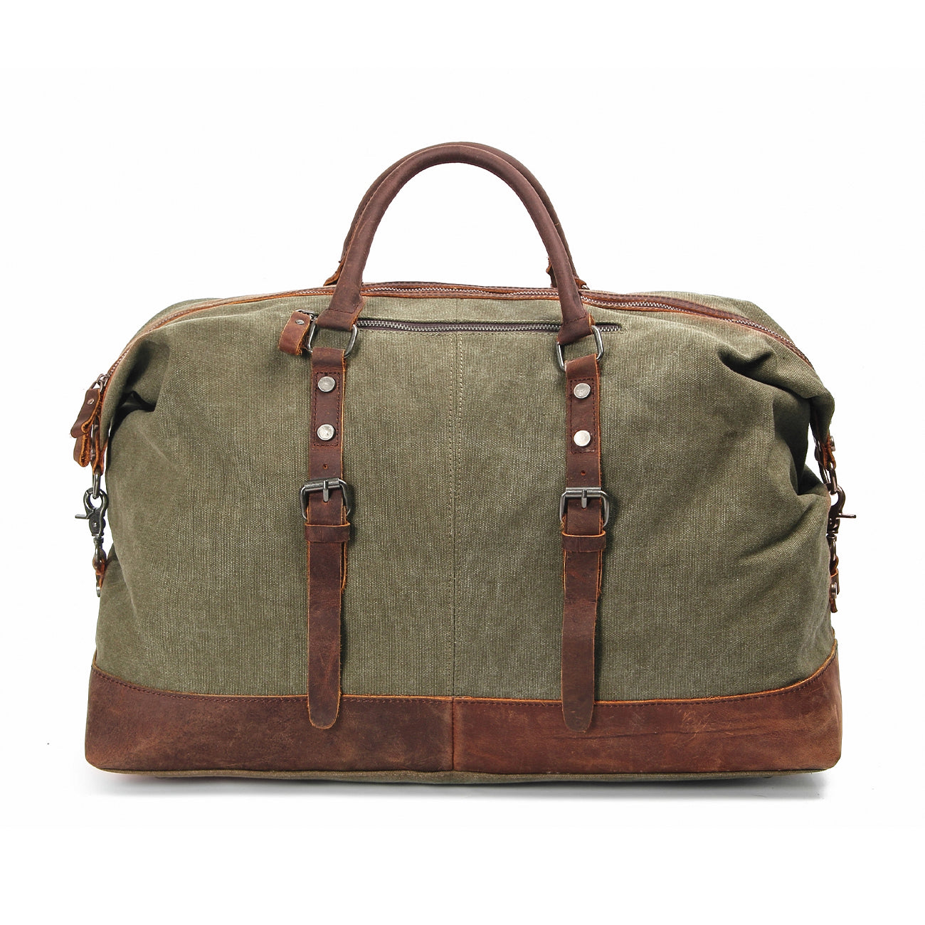reinforced leather straps and buckled top leather handles of a vintage duffle bag