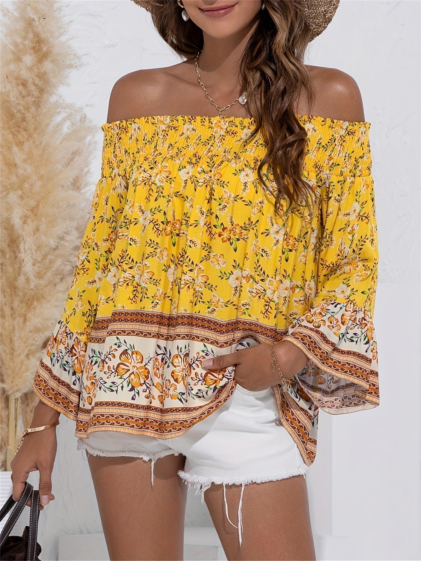 Audrey - Stilvolle schulterfreie Bluse mit Blumendruck