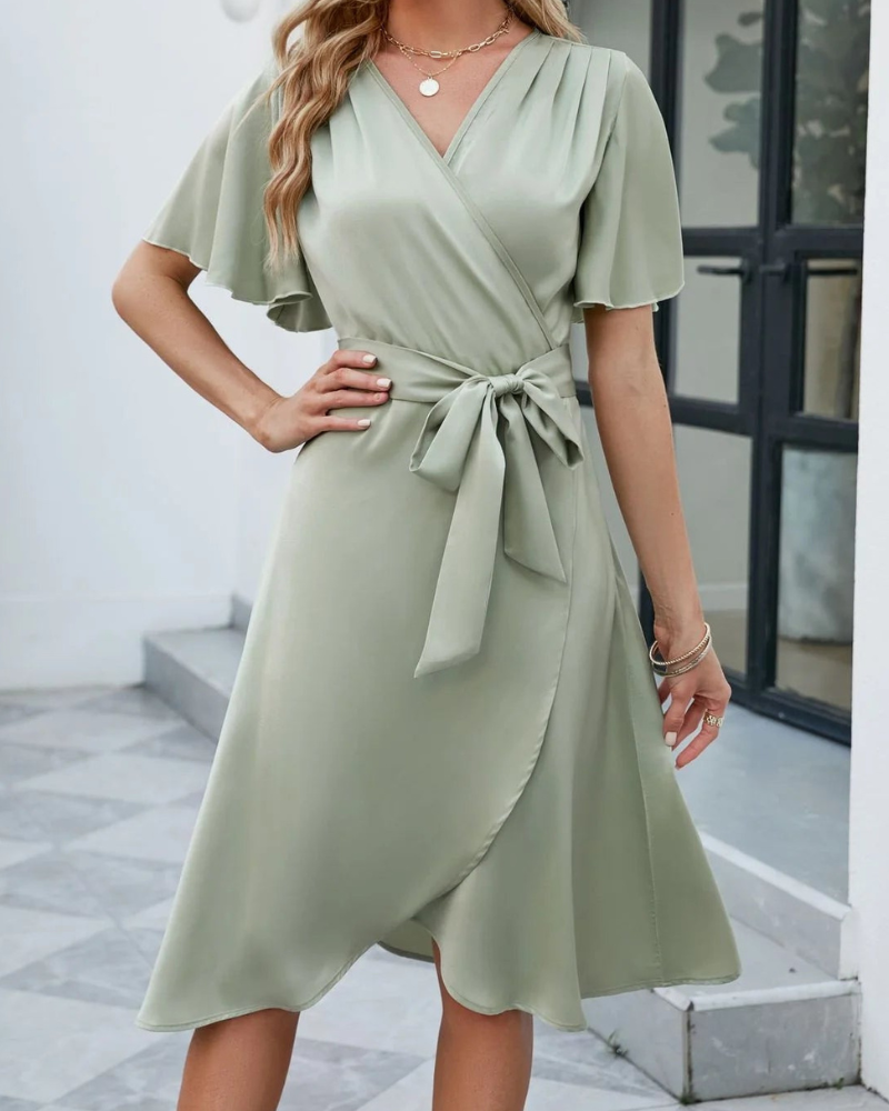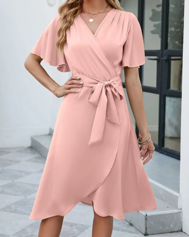 Athena - Elegantes, ausgestelltes Kleid mit kurzen Ärmeln und einem V-Ausschnitt mit Bindegürtel