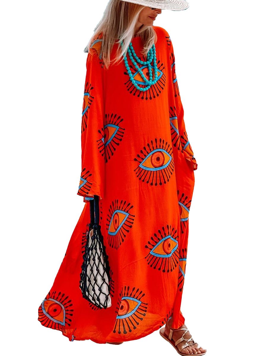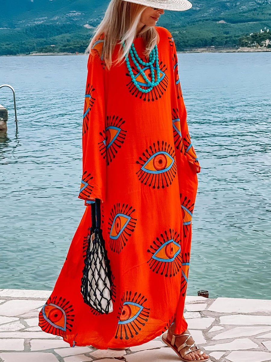 Selma - Rundhals Kunst Augen Druck lässig Urlaub Langarm Maxikleid