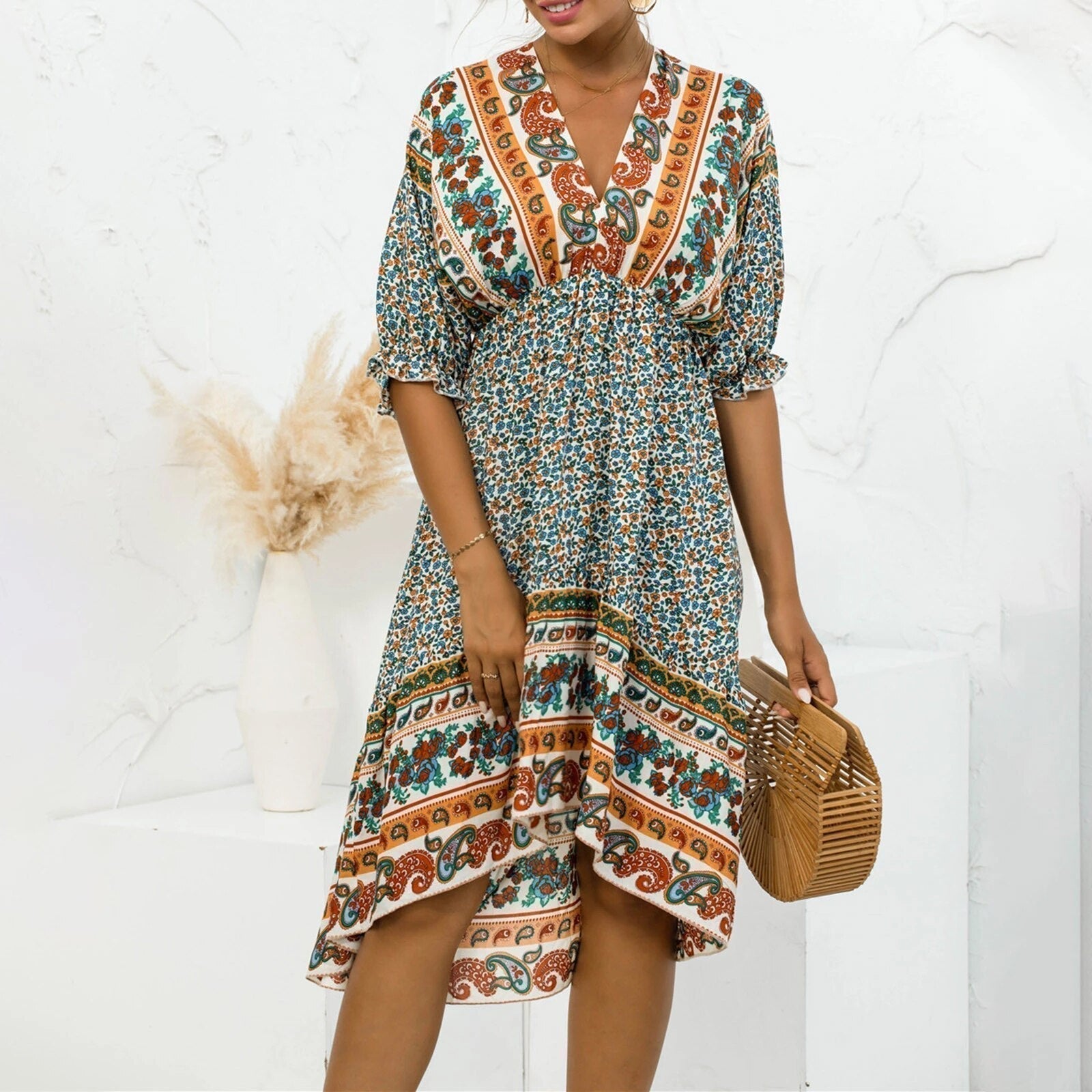 Verosha - Stilvolles Midikleid mit tiefem V-Ausschnitt und halben Ärmeln mit Blumenmuster