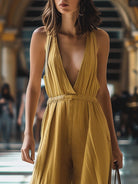 Emilia - V-Ausschnitt lässiger Retro Elastik Taille weites Bein Denim Jumpsuit